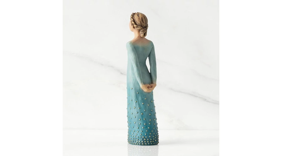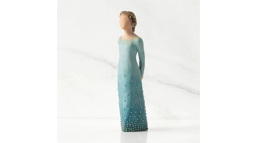 Ez az elegáns, oszlopszerű Willow Tree figura világos bőrtónussal és világosabb hajjal készült. Mélykék, aranyleveles ruhája és méltóságteljes tartása a belső erő, az önbecsülés és a fejlődés szimbóluma. Tökéletes választás annak, aki épp önbizalmát építi, túl van egy kihíváson, vagy tudatosan halad a lelki egészség útján.